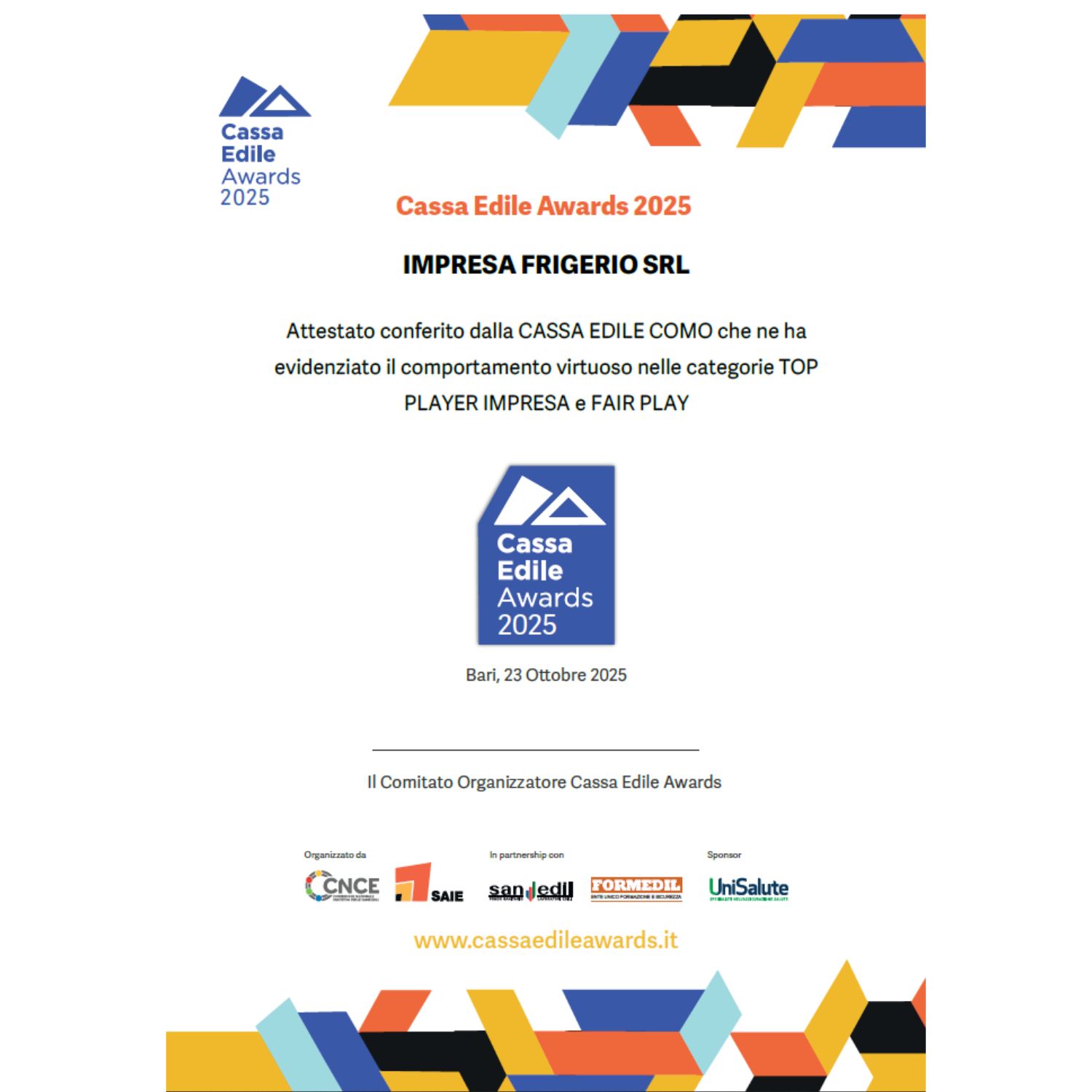 La Commissione nazionale paritetica delle Casse Edili (CNCE) ha assegnato all’Impresa Frigerio il premio “Cassa Edile Awards 2025” come “Top Player Impresa” e “Fair Play”. “Il riconoscimento che vi è stato tributato – scrive la CNCE - è il ringraziamento del sistema bilaterale e della Cassa edile di Como che ha segnalato il vostro comportamento virtuoso. L'obiettivo di questo prestigioso riconoscimento è quello di valorizzare le aziende che contrastano la concorrenza sleale distinguendosi per il rispetto delle regole e dei contratti collettivi nazionali”.